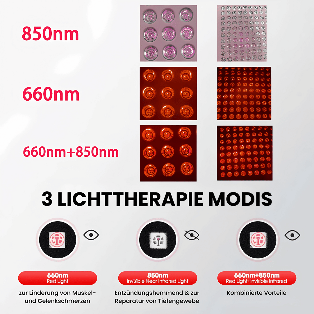 • Lichtwellenlängen: 660nm (sichtbares Rotlicht), 850nm (unsichtbares Nahinfrarotlicht)